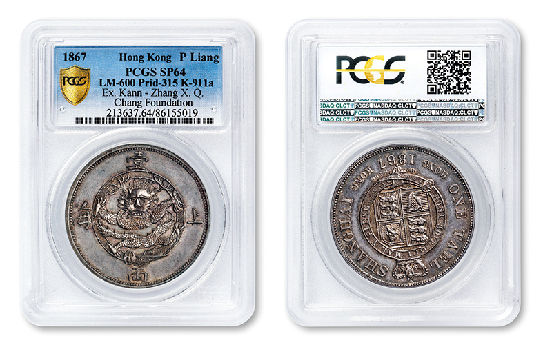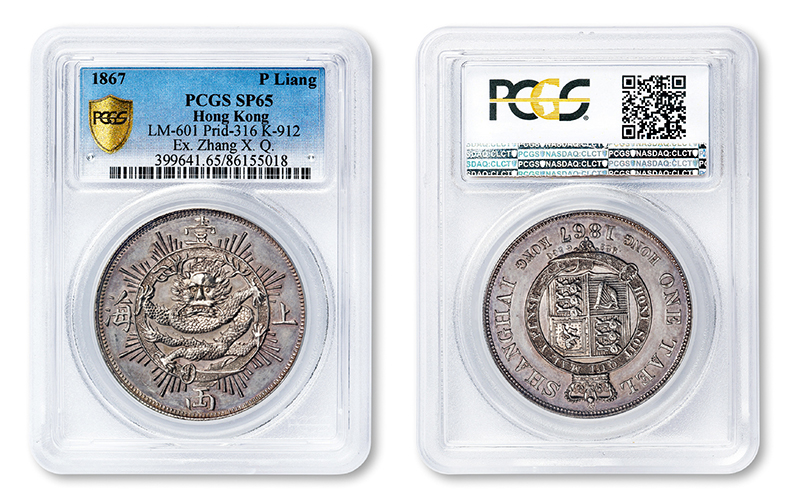 1867年上(shàng)海壹兩“有(yǒu)射線”版銀币樣币一枚,K-912/LM-601,香港造币廠試鑄,未發行(xíng);“上(shàng)海壹兩”樣币當時(shí)共試鑄二種款式,以龍圖外圈芒線區(qū)分為(wèi)有(yǒu)射線、無射線版,雖然最後有(yǒu)射線版被選定作(zuò)為(wèi)上(shàng)呈呈樣,有(yǒu)小(xiǎo)量鑄造,終因未獲清廷采納而被銷毀,迄今所見有(yǒu)公開(kāi)拍賣紀錄者屈指可(kě)數(shù),屬中國近代機制(zhì)銀币珍罕品種;樣币鑄工精美絕倫,版底亮潔如鏡,光可(kě)鑒人(rén),保存完美無瑕,PCGS SP65,目前該公司評級紀錄中僅有(yǒu)三枚,此枚分數(shù)冠居榜首,彌足珍貴
