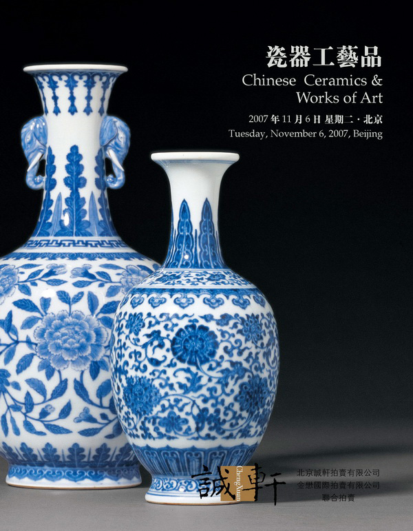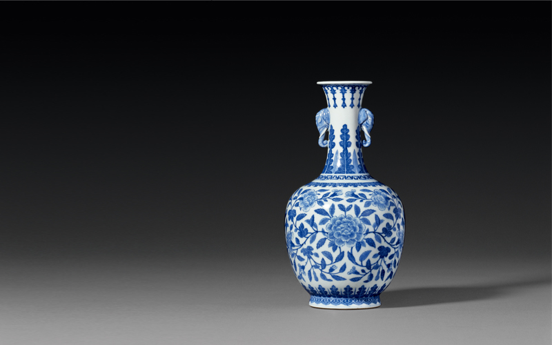 26.7cm.Diam. 此瓶造型獨特,于撇口觀音(yīn)瓶器(qì)形基礎上(shàng),将頸部收細,兩側加飾象耳,形成太平有(yǒu)象之意義。全器(qì)紋飾自口沿而下,共分七層,其中将茶花(huā)葉按蕉葉形狀進行(xíng)排列,和(hé)帶狀石榴瓜形裝飾,極為(wèi)特殊。瓶身所繪纏枝茶花(huā)紋,取茶花(huā)長春、長壽之意進行(xíng)裝飾,繪畫(huà)精細,花(huā)葉正背兩面,以深淺兩種青花(huā)顔色加以區(qū)分,匠心獨具。