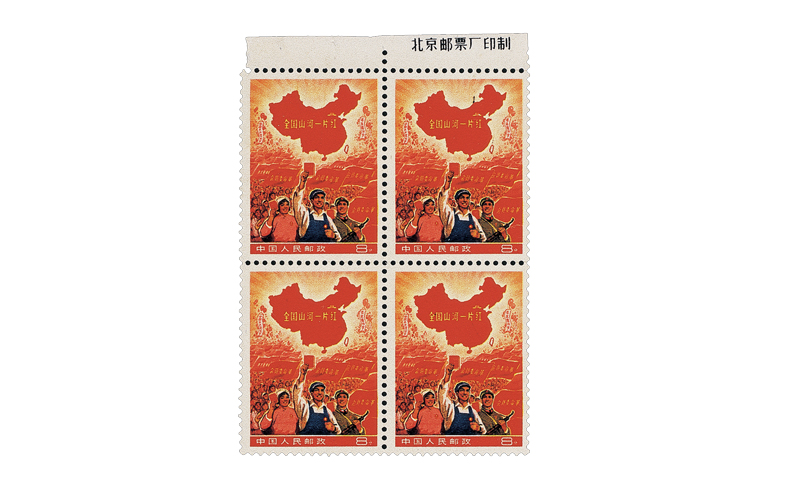 ★★1968年“全國山(shān)河(hé)一片紅”撤銷發行(xíng)郵票(piào)四方連,帶上(shàng)邊紙及廠銘,右上(shàng)一枚有(yǒu)一處微小(xiǎo)鏽痕,中間(jiān)齒孔輕折,色彩鮮豔,原膠未貼,上(shàng)中品