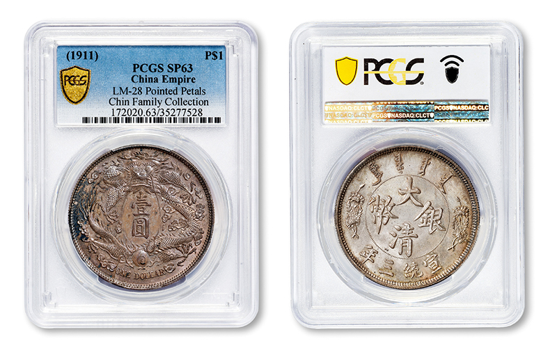 宣統三年大(dà)清銀币“長須龍”版壹圓樣币一枚,K-223/LM-28,1911年度支部天津造币總廠試鑄,未發行(xíng),是宣統三年銀主币系列中最具人(rén)氣的品種;樣币鑄打極為(wèi)出色,字面筆劃深峻如斬,左右花(huā)葉葳蕤,脈絡分明(míng),龍面雲朵飄逸,龍身巍然聳立,龍額上(shàng)方雙角、頭部鬓發胡須、通(tōng)身鱗甲等細節處無一不精,于所見“長須龍”樣币中,屬極精美之作(zuò),工藝達近代機器(qì)鑄币之巅峰;與此同時(shí),此樣币版底細膩平整,經年氧化後币面呈現二種不同的視(shì)覺效果,一面包漿輕薄通(tōng)透,光澤瑩亮白潤,另面包漿深沉凝重,滿溢淡彩銀光,狀态洵屬不凡,PCGS SP63
