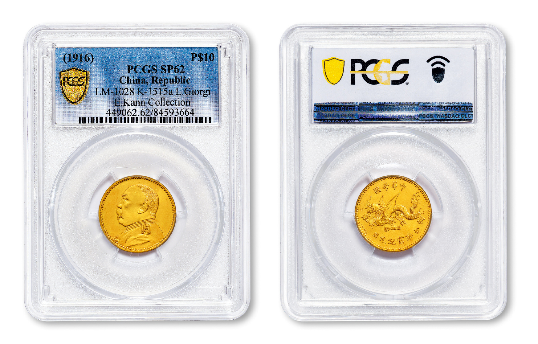 1916年袁世凱像中華帝國洪憲紀元飛龍“L.GIORGI”簽字版拾圓紀念金币樣币一枚,K-1515a/LM-1028,此枚為(wèi)袁世凱登基而準備鑄發的金币,俗稱“小(xiǎo)飛龍金币”,意大(dà)利籍總雕刻師(shī)路易·喬治(Luigi Giorgi)刻模,天津造币總廠試鑄,未發行(xíng),留存至今已不多(duō)見,而帶有(yǒu)雕刻師(shī)簽名之試鑄樣币,迄今僅發現屈指可(kě)數(shù)的幾枚,公開(kāi)拍賣鮮有(yǒu)出現;樣币圖案雕刻極盡精美,人(rén)像須發纖毫畢現,肩章五星尖聳,飛龍威武靈動,邊齒及內(nèi)齒淩厲整饬,品相完好,PCGS SP62,目前為(wèi)該公司此品種評級紀錄之唯一,價值非凡