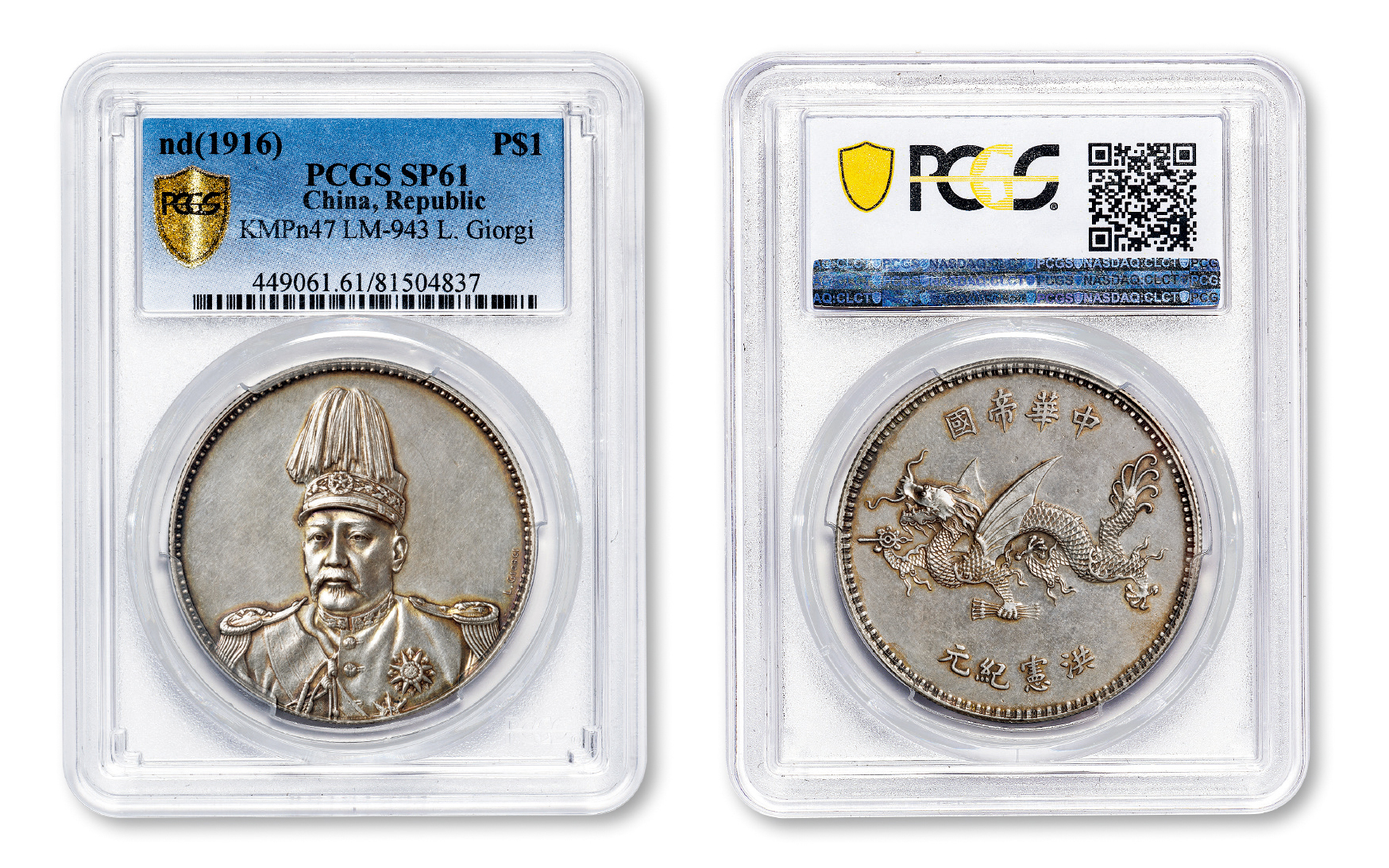 1916年袁世凱像中華帝國洪憲紀元飛龍“L.GIORGI”簽字版紀念銀币樣币一枚,KM-Pn47/LM-943,意大(dà)利籍總雕刻師(shī)路易·喬治(Luigi Giorgi)刻模,天津造币總廠試鑄,版模深峻,工藝精湛,堪稱中國近代機制(zhì)币鑄造之典範;據查,此樣币目前存世僅數(shù)枚,備受藏家(jiā)珍視(shì),公開(kāi)拍賣價值不菲,在國際重要錢(qián)币拍賣會(huì)上(shàng)的成交價,甚至高(gāo)于同場(chǎng)次其他清代和(hé)民國時(shí)期的高(gāo)等級樣币,當屬民國時(shí)期人(rén)像币頂級珍品,PCGS SP61