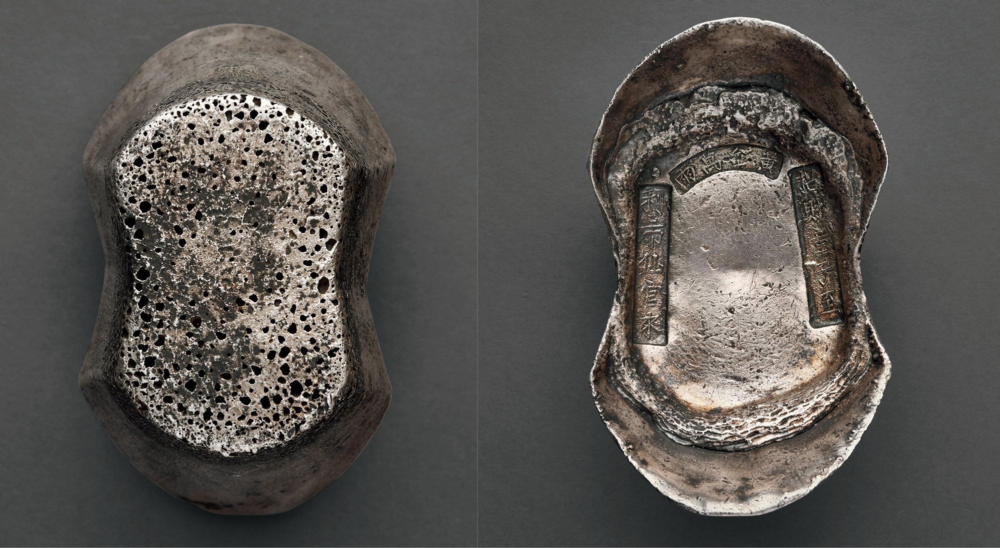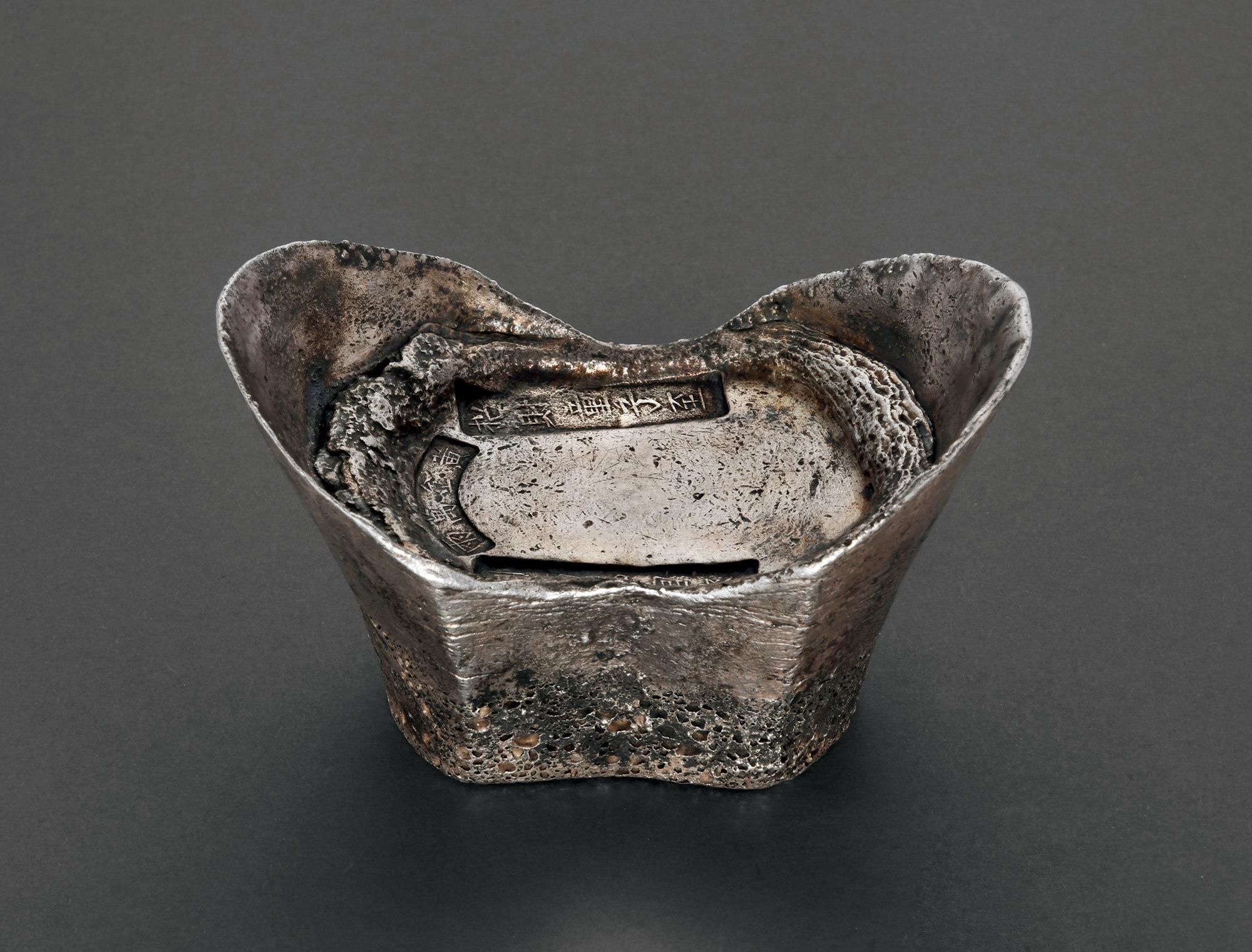 清代山(shān)東“黃金萬兩 招财童子至 利市仙官來(lái)”五十兩開(kāi)爐吉語錠一枚,重量:1858.6克;此類吉語錠是歲初開(kāi)爐鑄寶時(shí),銀爐特别鑄造的賀歲鎮爐寶銀,通(tōng)常銘文為(wèi)吉祥語,喻示新歲财運亨通(tōng);開(kāi)爐吉語錠一般不流通(tōng),因鑄造數(shù)量稀少(shǎo),工藝較普通(tōng)品更為(wèi)精美,銘文寓意吉祥,常被商民作(zuò)為(wèi)鎮宅之寶收藏供奉;山(shān)東五十兩吉語大(dà)寶的銘文還(hái)見有(yǒu)“一本萬利”、“天官賜福”等,“黃金萬兩”則最為(wèi)稀少(shǎo),一直以來(lái)深受藏家(jiā)追捧;拍品錠型規整,寶面開(kāi)闊,三方戳記平正清晰,包漿自然,錠體(tǐ)滿溢淡彩銀光,品相極佳,GBCA AU58