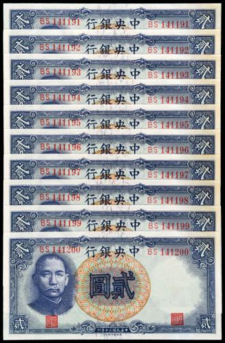 1941, The Central Bank of China, 2 Yuan, Total 10 pcs., Consecutive Numbers, AU