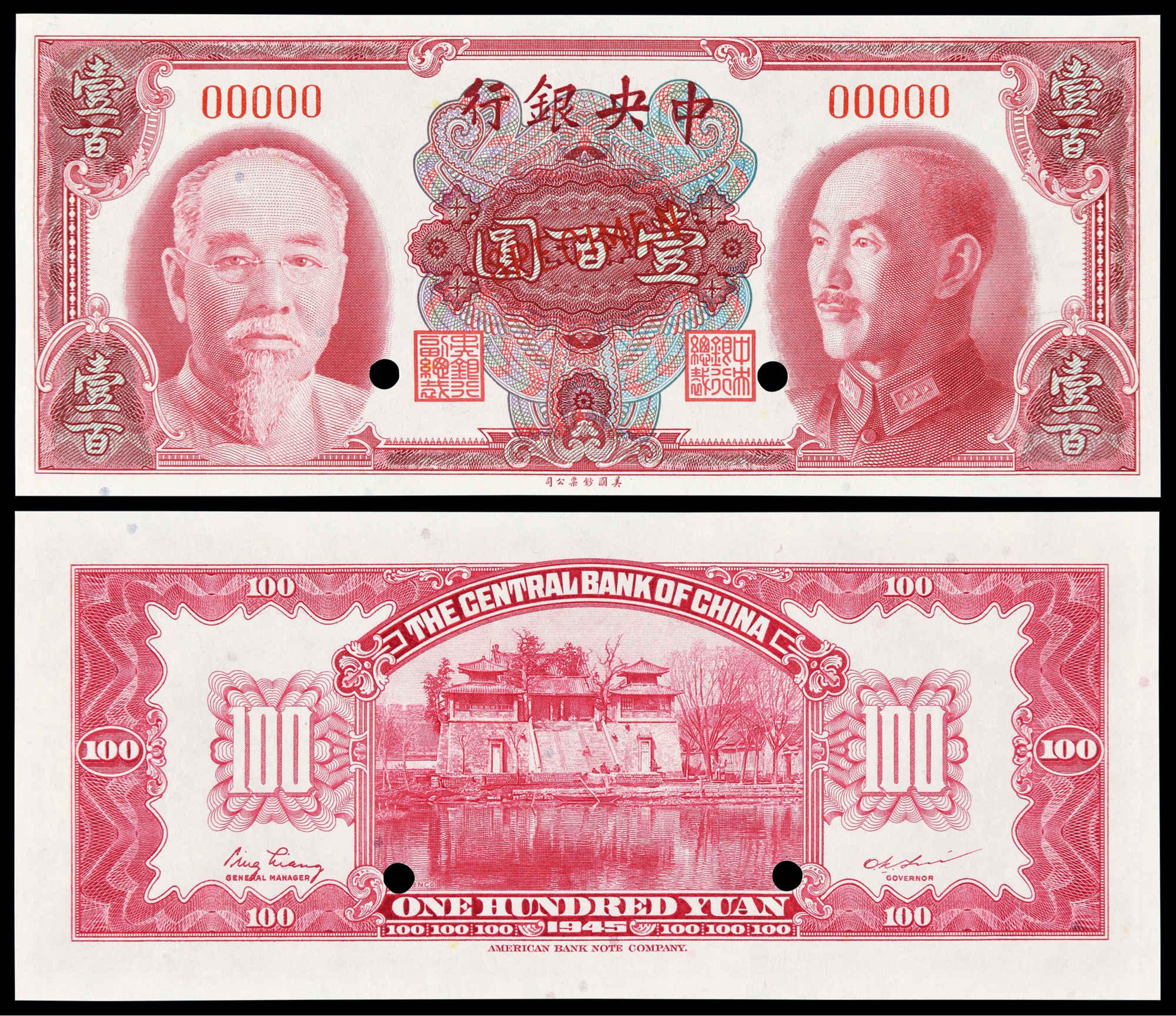 1945, The Central Bank of China, 100 Yuan, Specimen, AU
