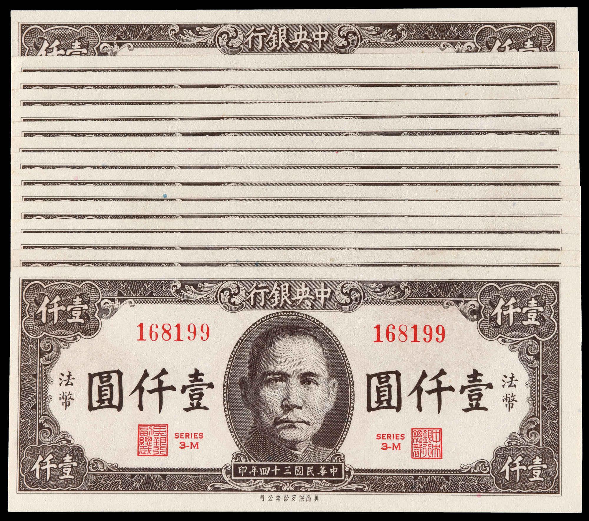 1945, The Central Bank of China, 1,000 Yuan, Total 15 pcs., Mostly Consecutive Numbers, AU