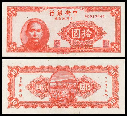 1945, The Central Bank of China, 10 Yuan, Taiwan, Rare, AU