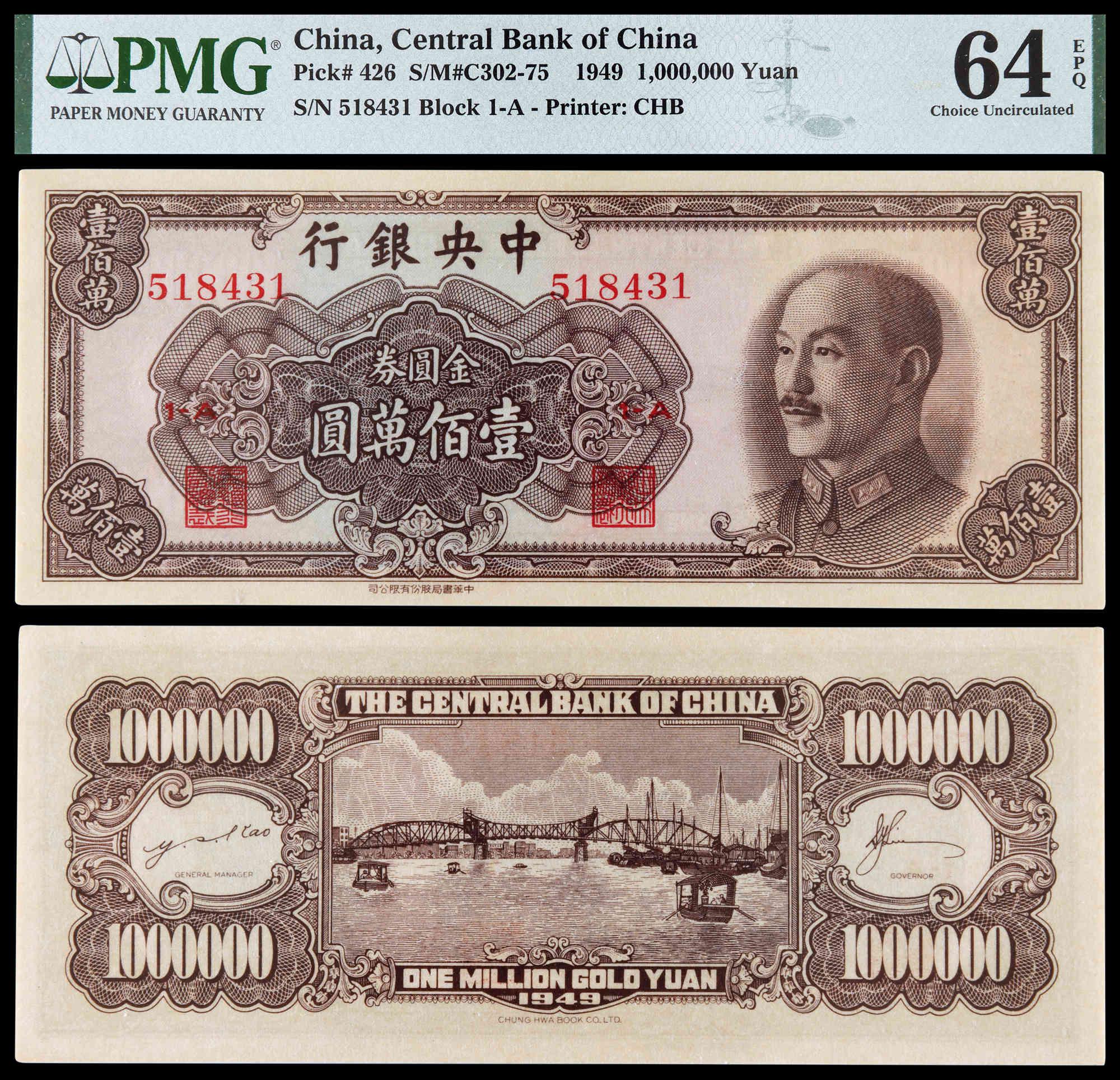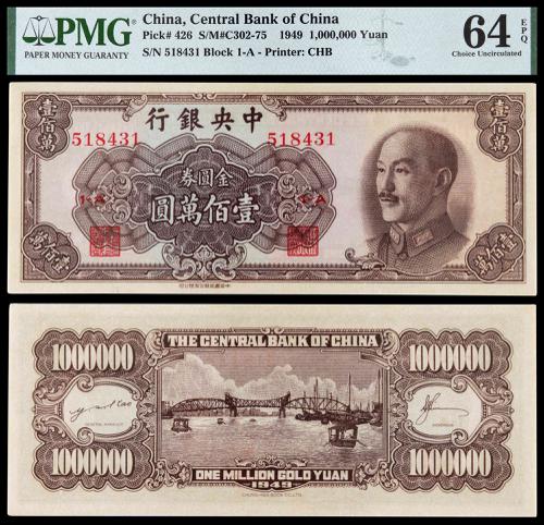 1949, The Central Bank of China, 1 Million Yuan, PMG 64EPQ