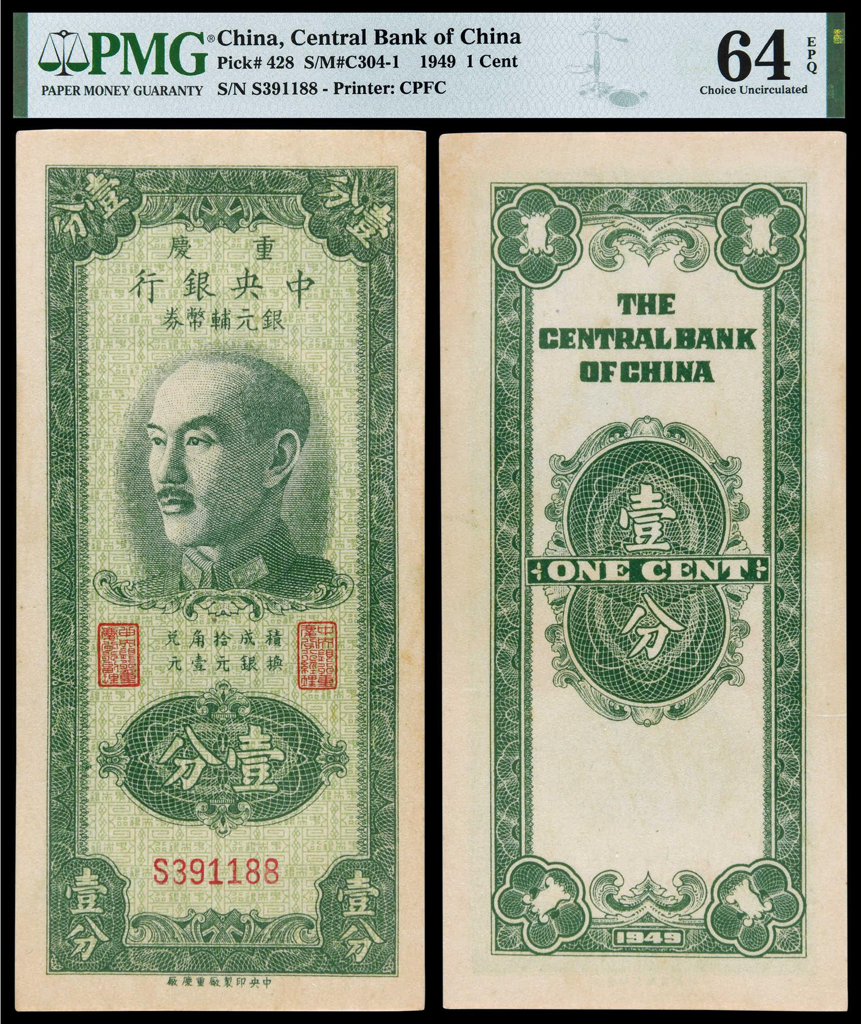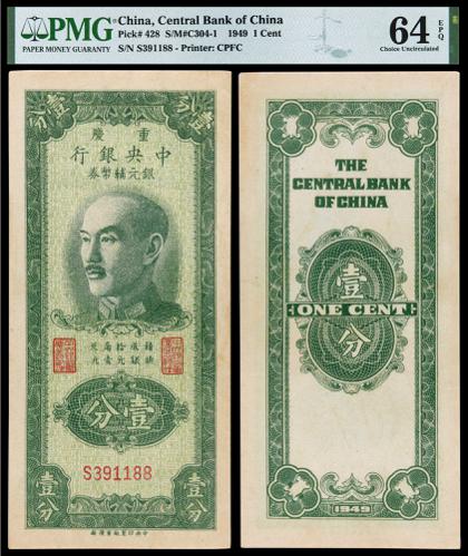 1949, The Central Bank of China, 1 Cent, PMG 64EPQ