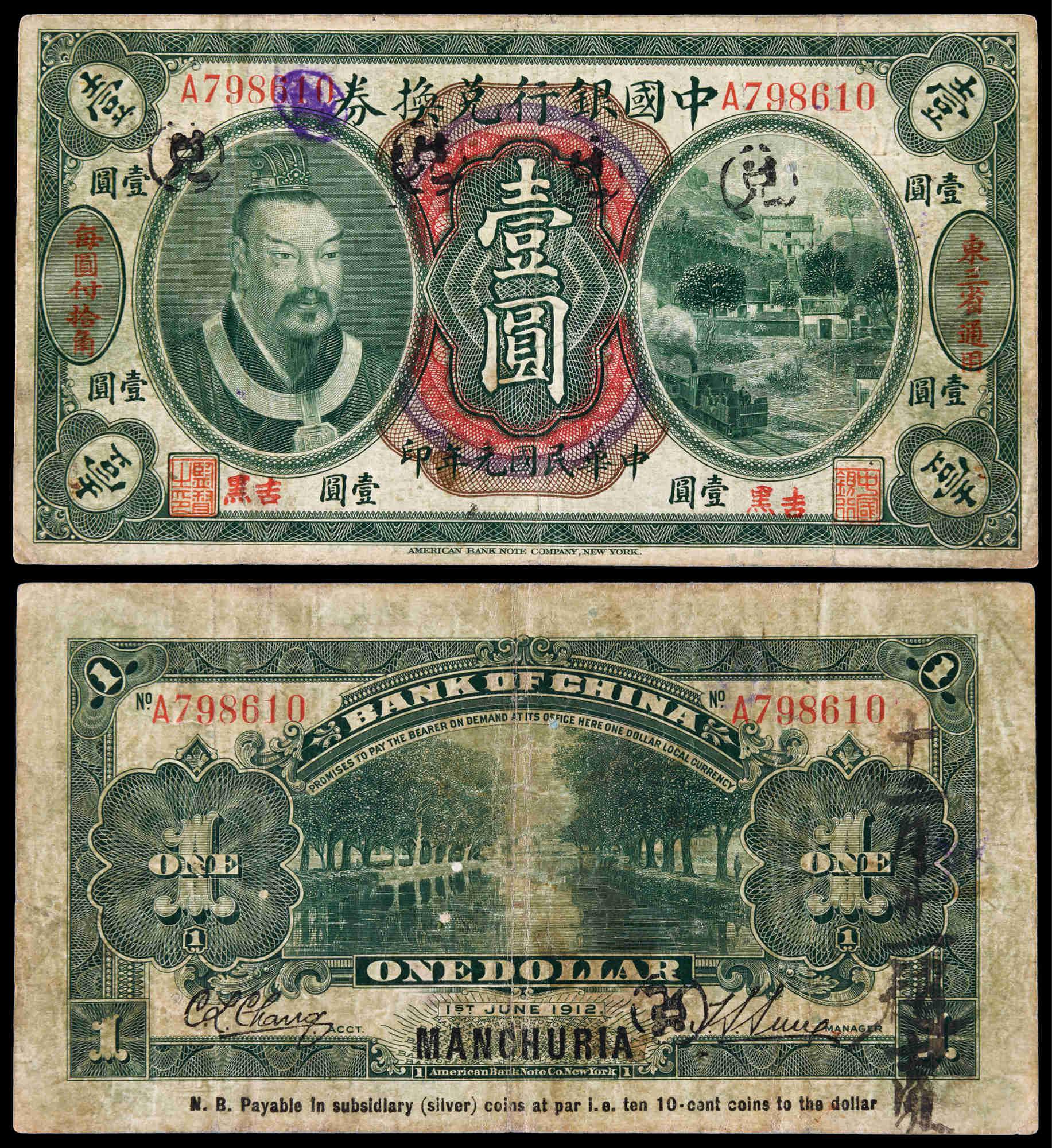 1912, Bank of China, 1 Yuan, Manchuria, Rare, VF