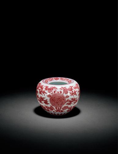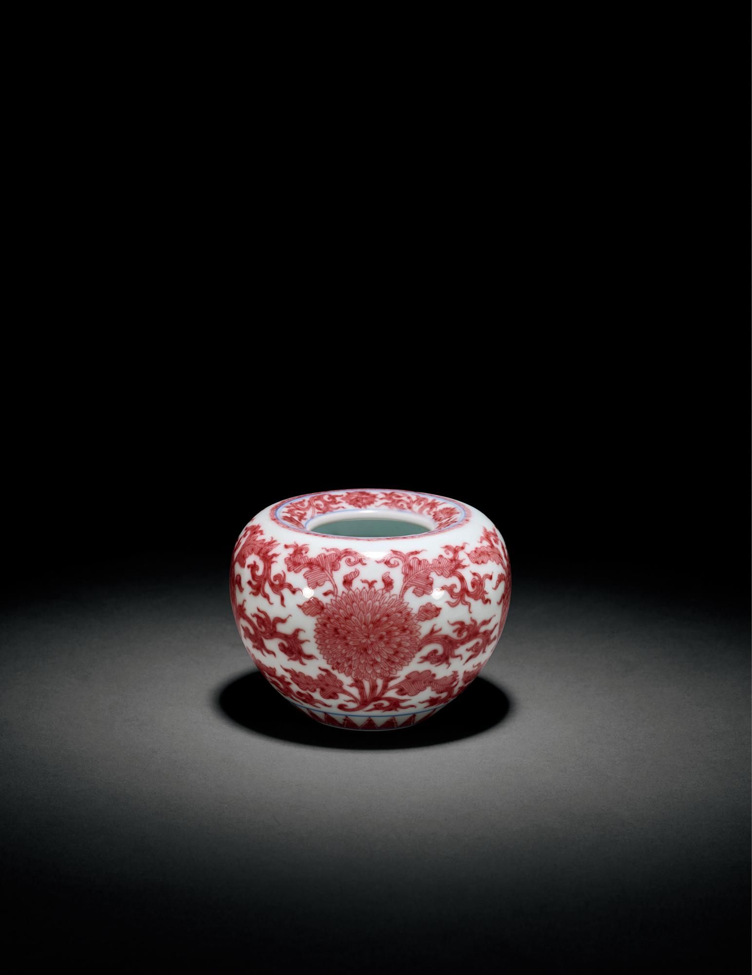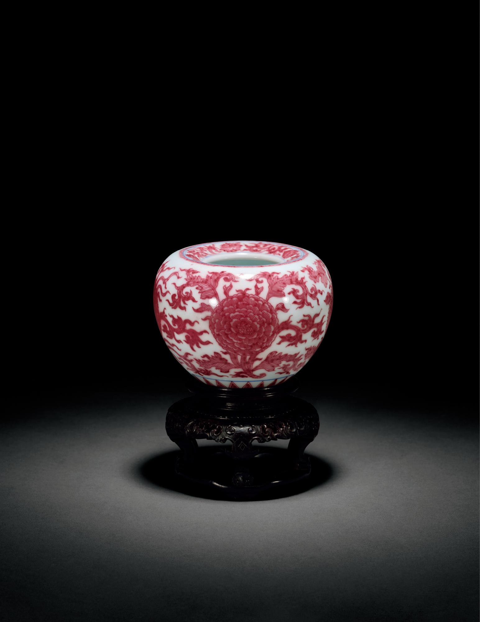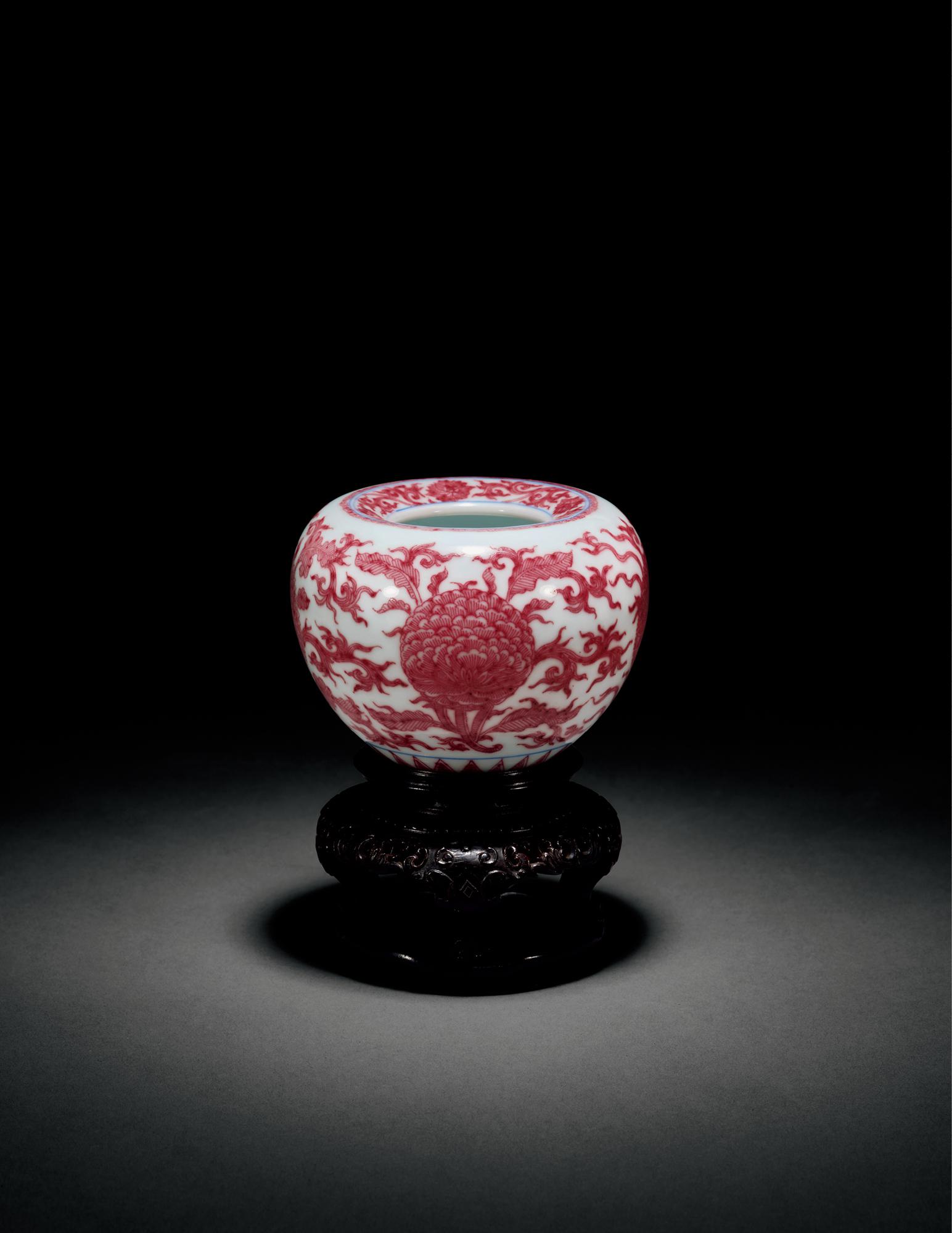 康熙時(shí)期的禦窯文房(fáng)用瓷,實用性和(hé)觀賞性達到了高(gāo)度統一,體(tǐ)現景德鎮禦窯廠制(zhì)瓷的高(gāo)超水(shuǐ)平。據相關研究成果,以豇豆紅、天藍(lán)釉、釉裏紅為(wèi)代表的無圈三行(xíng)六字款文房(fáng)器(qì)約燒造于康熙二十年至二十七年間(jiān)。除得(de)益于臧應選等駐廠官員的嚴格把關外,曾供奉內(nèi)廷的漢軍旗人(rén)劉源亦功不可(kě)沒,《清史稿》及劉廷玑《在園雜志(zhì)》均稱其曾呈進瓷樣,“參古今之式,運以新意,備諸巧妙,于彩繪人(rén)物、山(shān)水(shuǐ)、花(huā)鳥,尤各極其勝。及成,其精美過于明(míng)代諸窯。”本場(chǎng)拍賣的康熙釉裏紅團花(huā)紋蘋果尊,器(qì)形渾圓小(xiǎo)巧,釉質溫潤如玉,四組釉裏紅團花(huā)紋發色皆明(míng)豔均勻,實為(wèi)康熙禦窯文房(fáng)用器(qì)之精品,值得(de)珍視(shì)。