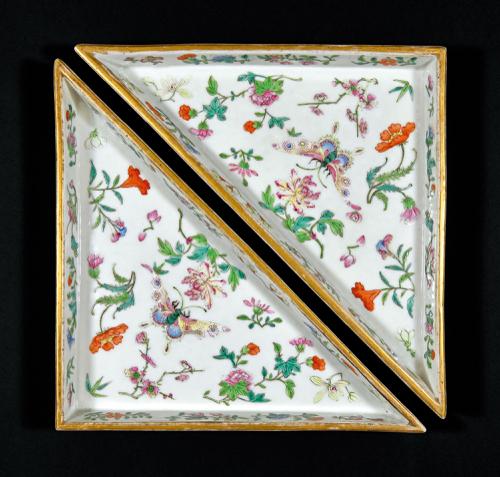 A PAIR OF FAMILLE ROSE TRIANGLE DISHES