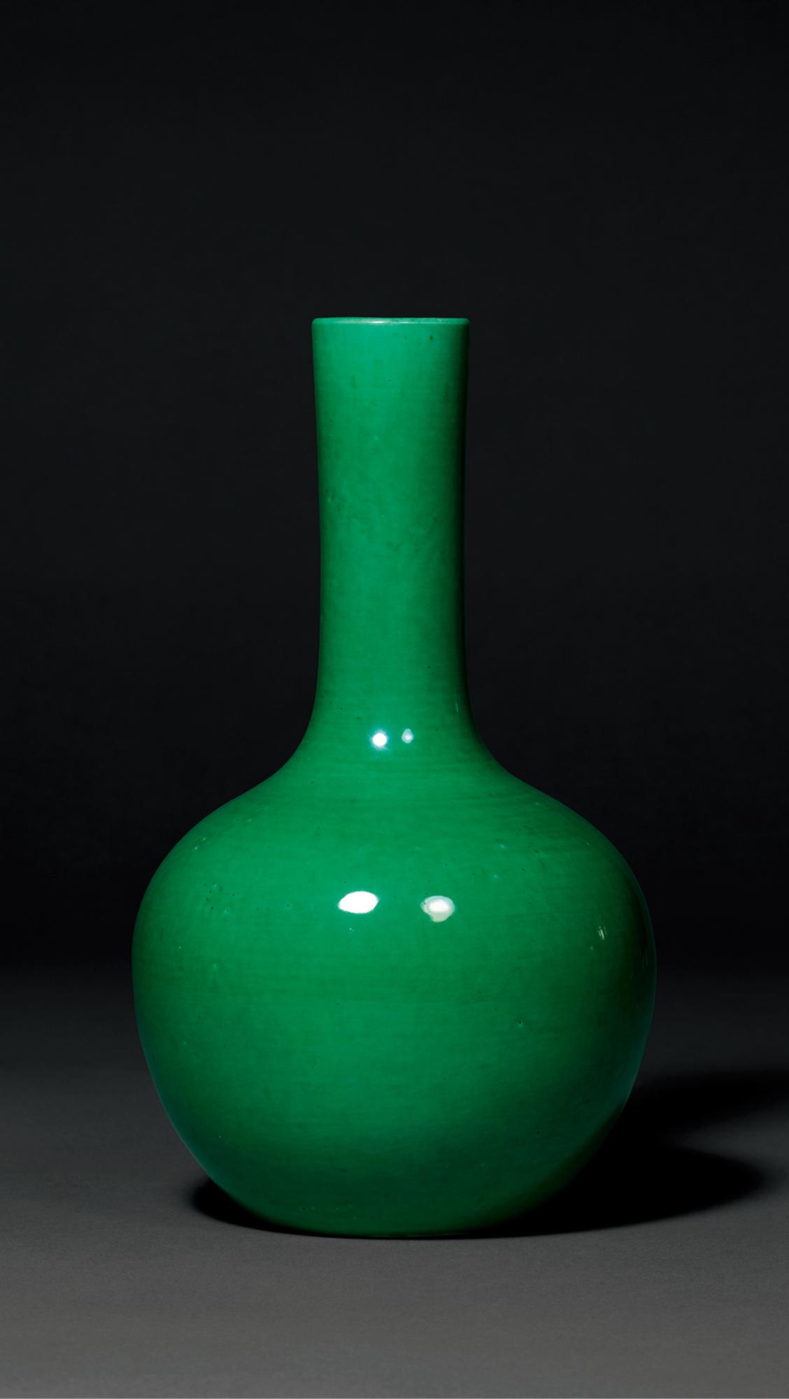 A SMALL FINE GREEN GLAZED TIANQIUPING VASE