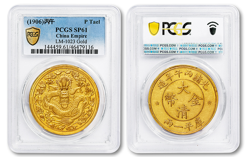 光緒丙午年造大(dà)清金币庫平一兩樣币一枚,K-1540/LM-1023,光邊大(dà)雲版,1906年戶部造币總廠以純金試鑄,是中國唯一以中央名義制(zhì)作(zuò)的金币,因清政府藏金不足及金本位制(zhì)未立而未發行(xíng),存世僅見丙午、丁未年号樣币,均所見極少(shǎo);拍品鑄工精美,底版金色純正,光澤四溢,狀态頗佳,PCGS SP61 以往由于開(kāi)采量低(dī),黃金從未在中國通(tōng)貨上(shàng)扮演過重要角色,也從未出現過正式流通(tōng)的金币。甲午戰敗和(hé)庚子事變之後,因賠款以黃金為(wèi)計(jì)算(suàn)标準,白銀兌換黃金的下跌造成償還(hái)時(shí)所謂的“鎊虧”倍增,于是朝野急謀對策,再次有(yǒu)仿效歐美改革币制(zhì)從速實施金本位之議。