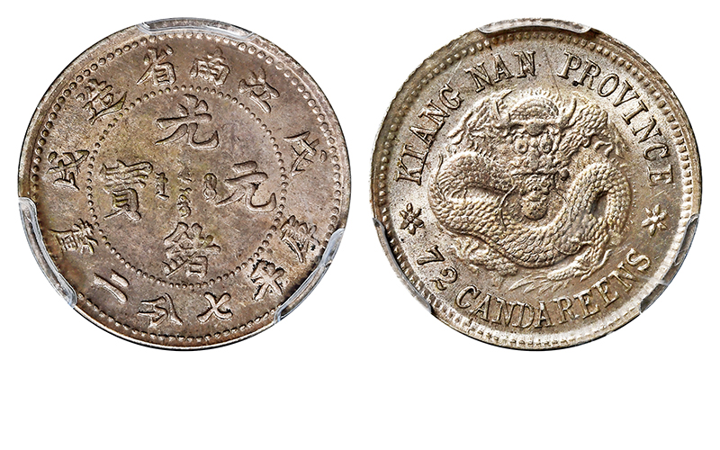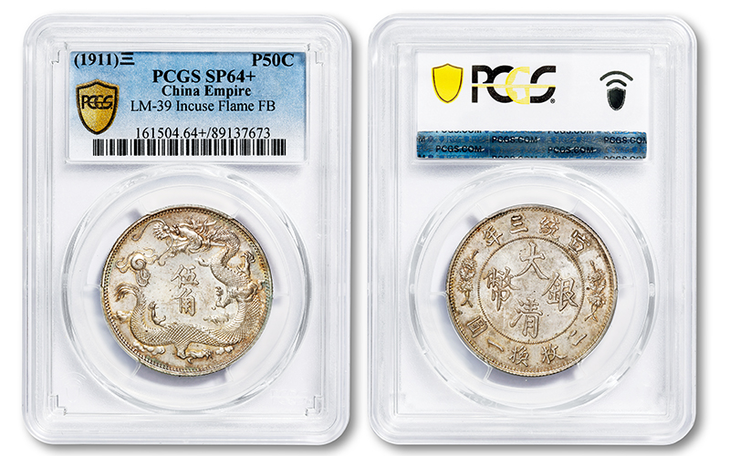 宣統三年大(dà)清銀币“立龍”伍角樣币一枚,Y-30/LM-39,1911年度支部造币總廠試鑄,未發行(xíng),鑄額稀薄;樣币鑄工卓越,內(nèi)齒銳利,龍鱗鋒刃,輕薄原味包漿之下,底版細膩亮澤,銀光充沛,實為(wèi)此一品種品相之佼佼者,殊為(wèi)難得(de),PCGS SP64+,目前為(wèi)該公司評級紀錄亞軍分 “宣三”大(dà)清銀币系列在制(zhì)定之時(shí)包括伍角、貳角、壹角三種十進制(zhì)銀輔币,銘文分别注明(míng)二枚、五枚、十枚換一圓。背面圖案為(wèi)“立龍”,龍珠位于左上(shàng)角而非中央或下方,此種設計(jì)在龍銀中非常罕見。因新币發行(xíng)的慣例是主币先行(xíng),故計(jì)劃在新壹圓國币通(tōng)行(xíng)後再跟進,但(dàn)辛亥革命的突然爆發使銀輔币沒有(yǒu)批量生(shēng)産。在數(shù)量不多(duō)的銀輔币中,以伍角最為(wèi)稀少(shǎo),從其雕刻風格來(lái)看,雕刻師(shī)應為(wèi)曲須龍作(zuò)者喬治,貳角及壹角龍面的雕刻者應為(wèi)餘子貞。—摘自孫浩編著《百年銀圓》,上(shàng)海科學技(jì)術(shù)出版社,2012年,頁113。
