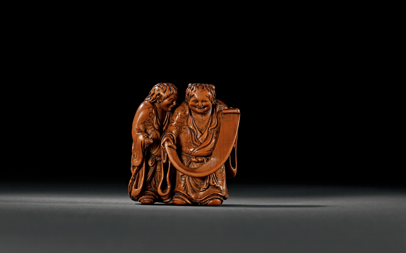 黃楊木紋理(lǐ)細膩,色澤典雅,歲月積澱後包漿日趨紅潤,為(wèi)珍貴的雕刻材料。 拍品尺寸小(xiǎo)巧,圓雕和(hé)合二仙,均眉開(kāi)眼笑,寒山(shān)雙手展開(kāi)畫(huà)卷,拾得(de)立于其側後,右手執掃帚,左臂搭于寒山(shān)背部,一同觀畫(huà),二仙形象與台北故宮博物院藏明(míng)商喜《四仙拱壽圖》所繪相似。雕刻極為(wèi)精心,二人(rén)發式、衣紋、鞋底樣式均不雷同;拾得(de)因側身姿态被寒山(shān)遮擋部分面容,空(kōng)間(jiān)狹小(xiǎo)甚難施刀,然其五官刻畫(huà)、表情之鮮活分毫未減,藏鋒技(jì)藝堪稱鬼斧神工。