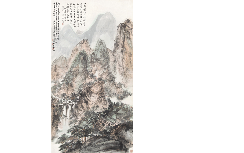 173×92 cm. 約14.4平尺 上(shàng)世紀四十年代後期,是傅抱石山(shān)水(shuǐ)風格完善至純熟境地的階段。《山(shān)瀑清會(huì)》作(zuò)于1949年二月,由于局勢動蕩,傅抱石此年作(zuò)品不多(duō),流傳至今者更稀少(shǎo)。畫(huà)幅逾十四平尺,氣勢磅礴,尺幅之大(dà)在其四十年代山(shān)水(shuǐ)中實屬珍罕,畫(huà)家(jiā)亦自稱“三年來(lái)寫大(dà)幅,此為(wèi)第二次也”,堪稱其山(shān)水(shuǐ)的代表巨制(zhì)。傅二石先生(shēng)如此評價道(dào):“即使在傅抱石這位公認的大(dà)師(shī)的作(zuò)品中,此幀《山(shān)瀑清會(huì)》也稱得(de)上(shàng)是真正的精彩之作(zuò)。”