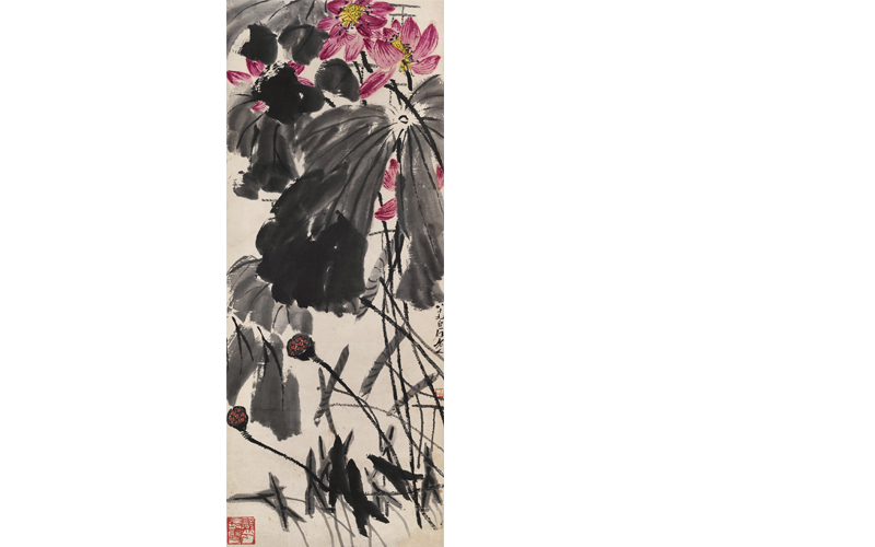 154×61 cm. 約8.5平尺 全作(zuò)意境生(shēng)動,觀之如臨荷塘,若有(yǒu)荷香飄散,洋溢着旺盛的生(shēng)命力。筆墨布局的經營堪稱精湛完美,顯示出耄耋之年的畫(huà)家(jiā)旺盛的精力和(hé)創造力。