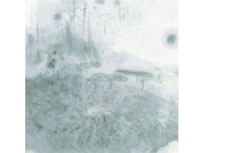 1992年作(zuò) 鏡心 設色紙本 51×50.5 cm. 約2.3平尺 此畫(huà)中一大(dà)片荷葉舒展鋪陳,迷離的雨霧中隐約可(kě)見低(dī)垂的蓮蓬、枯敗的殘葉、半開(kāi)的花(huā)苞及初展的嫩葉,新生(shēng)與衰敗共存,幻化出畫(huà)家(jiā)心中的意念。物象皆作(zuò)模糊與虛幻的處理(lǐ),在抽象中呈現精微的趣味,是為(wèi)周思聰荷花(huā)語言的最大(dà)特色。水(shuǐ)、墨、色、礬及肌理(lǐ)的運用不見刻意,自然地滲透入作(zuò)品。在墨色暈灑中控制(zhì)物象的形态,荷梗與花(huā)瓣略事勾畫(huà),與細碎縱橫的筋脈統一在浸潤的翠色中,甯靜空(kōng)濛。