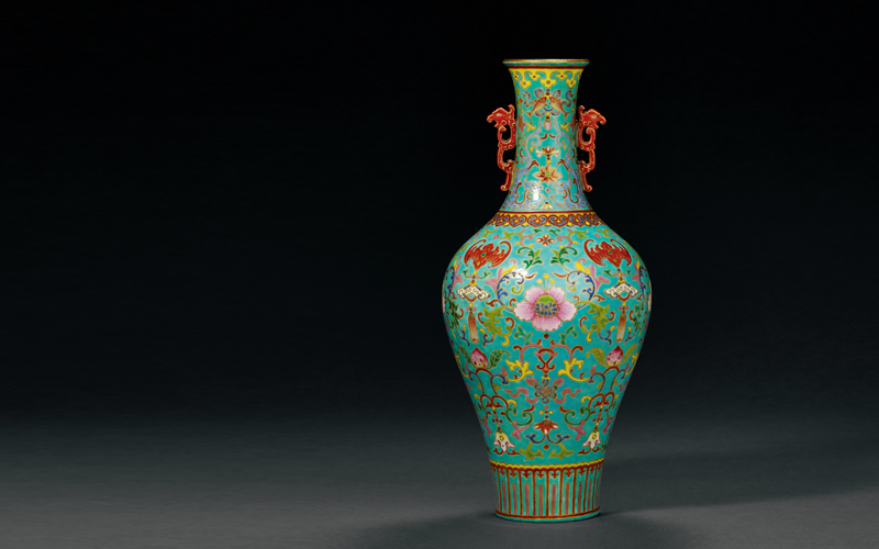 37cm. High 拍品以藍(lán)彩為(wèi)地,彩料填繪紋飾,其色彩與金邊勾描的方式,均與常見的松石綠地粉彩品種迥然不同,尤以藍(lán)地的彩料最為(wèi)明(míng)顯,其顔色偏近湛藍(lán),質感濃稠,以緻略有(yǒu)深淺,其餘填繪紋飾的彩料則立體(tǐ)凸出,接近琺琅彩之質感。類似風格、特征者可(kě)見于故宮博物院藏品和(hé)放山(shān)居舊(jiù)藏之器(qì),當屬乾隆時(shí)期燒造仿掐絲琺琅的瓷器(qì)中最為(wèi)逼真、精細之品種,存世無多(duō),相當名貴。
