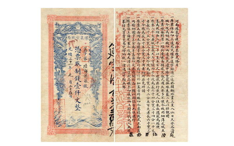 光緒三十一年河(hé)南豫泉官錢(qián)局制(zhì)錢(qián)票(piào)壹仟文一枚,筵字第陸百貳貳号,左下蓋紅色“河(hé)南豫泉官錢(qián)局”精細圖章,背面再加蓋号碼“筵陸伯貳拾貳”以及官印兩方;此票(piào)朱藍(lán)兩色印刷,色彩飽滿,保存較好,流通(tōng)票(piào)目前僅發現此一枚,極為(wèi)珍罕,七八成新