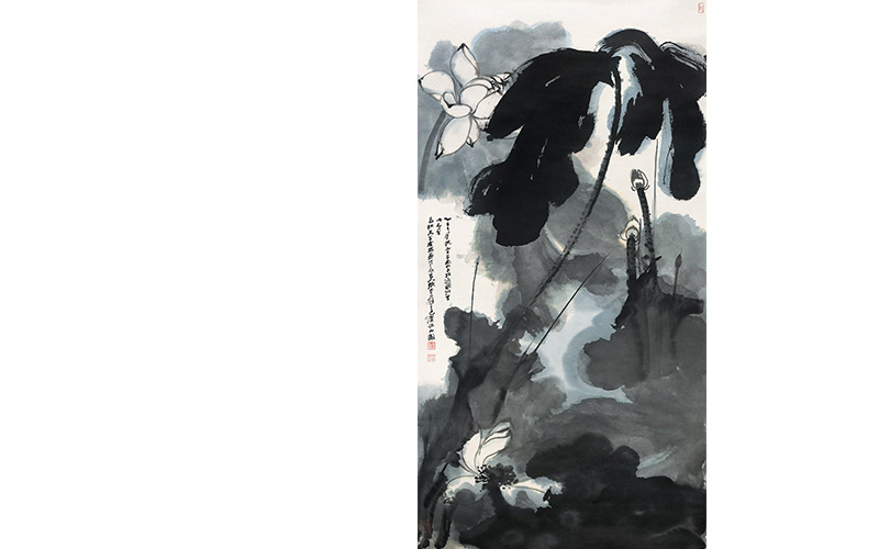 乙巳(1965年)作(zuò) 立軸 設色紙本 143.5×75.5 cm. 約9.8平尺 荷花(huā)為(wèi)張大(dà)千繪事一絕,他愛(ài)荷花(huā)的綽約娉婷之姿,又以荷花(huā)的“君子之風”自況,因此頗喜畫(huà)荷花(huā)。每遷居一地,必親手植荷,朝夕觀察。上(shàng)世紀六十年代初期,張大(dà)千創潑墨潑彩法,并以之寫荷,以“有(yǒu)法”進入到“法無定法”的境界,注重氛圍的營造,筆下荷花(huā)大(dà)開(kāi)大(dà)阖,氣勢豪放。