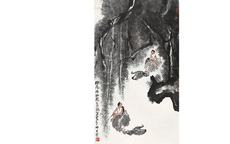 壬戌(1982年)作(zuò) 立軸 設色紙本 116×67.5 cm. 約7.1平尺 李可(kě)染筆下的牧牛題材肇始于上(shàng)世紀四十年代初,在重慶的李可(kě)染與牛棚比鄰而居,他喜歡牛的形象,并崇拜牛肯于奉獻犧牲的精神,因此便用水(shuǐ)墨畫(huà)起牛來(lái),更是以牛的勤勞自勉,刻“孺子牛”印章,名畫(huà)室為(wèi)“師(shī)牛堂”。他的畫(huà)牛圖被賦予極強的象征寓意,常題寫魯迅“俯首甘為(wèi)孺子牛”的詩句和(hé)郭沫若《水(shuǐ)牛贊詩》,歌(gē)頌牛的吃(chī)苦耐勞精神;他筆下的牧童與牛常常遊憩于四時(shí)美景中,融入他對山(shān)川風物的熱愛(ài),對勞動人(rén)民樸素生(shēng)活的贊頌與向往之情。