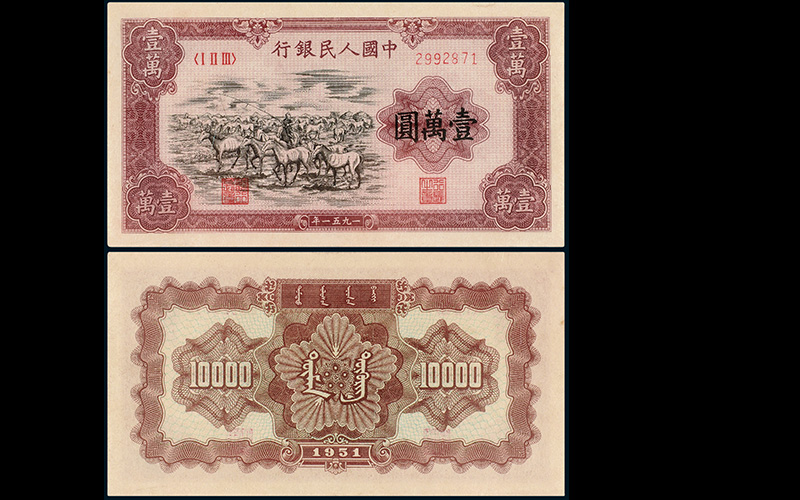 1951年第一版人(rén)民币壹萬圓“牧馬”一枚,背蒙文,新疆地區(qū)行(xíng)用,位列一版币六珍之首,有(yǒu)一版币票(piào)王之盛譽,存世稀少(shǎo),迄今為(wèi)止發現未逾百枚;此枚保持原始狀态,色彩飽滿,邊紙寬闊,是目前所見“牧馬”流通(tōng)票(piào)中的佼佼者,保存狀态在此之上(shàng)者屈指可(kě)數(shù),極為(wèi)珍罕,CMC40,八二成新