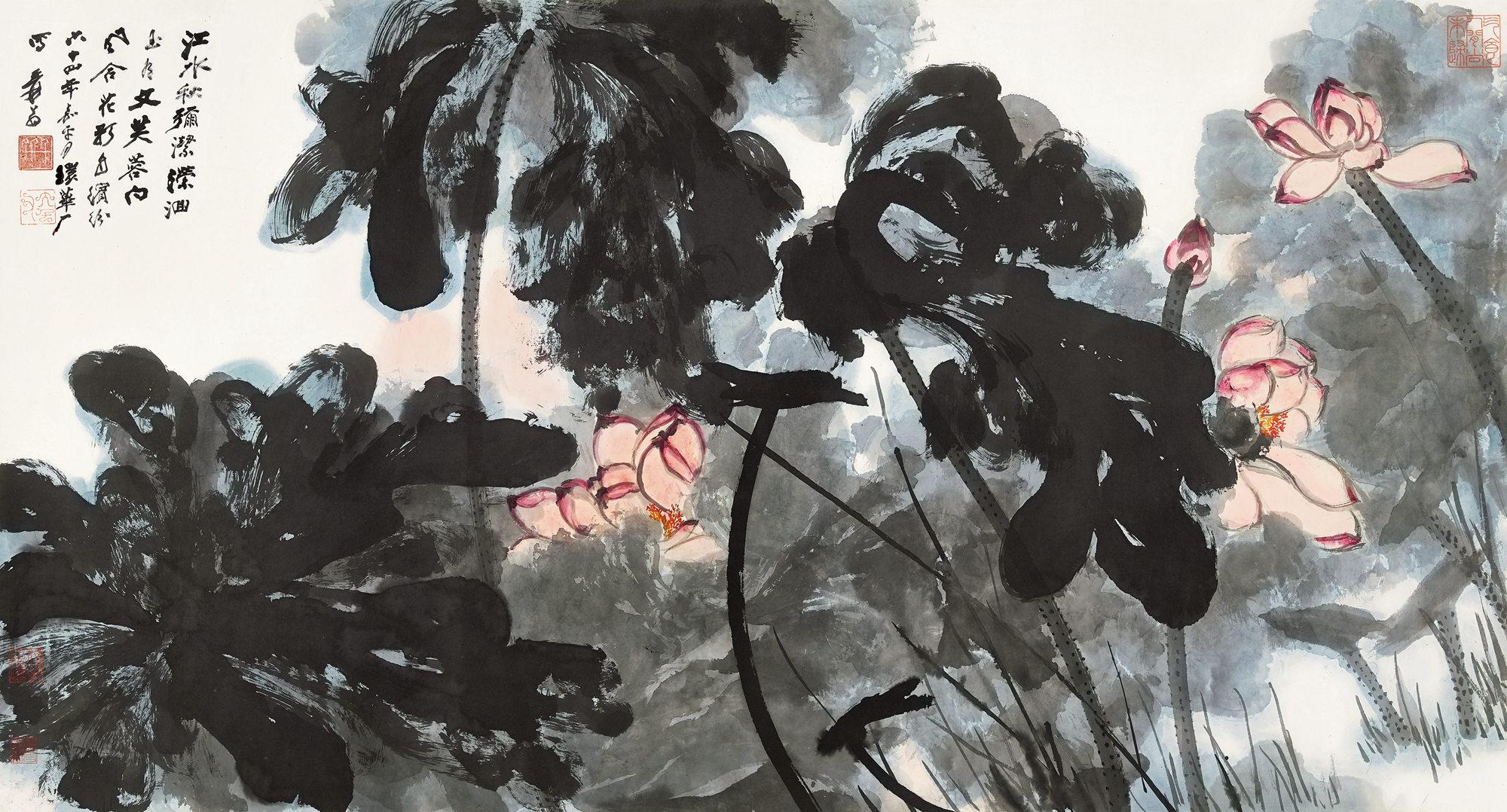 張大(dà)千《荷影(yǐng)缤紛》作(zuò)于1976年元月,系以潑墨法創作(zuò)的巨幅荷花(huā)作(zuò)品,特為(wèi)即将在當年舉辦的“歸國畫(huà)展”所繪,并收錄于同年出版的畫(huà)集,意義非凡。畫(huà)面橫幅宏闊,構圖飽滿,層次分明(míng),用筆雄渾豪放,氣勢恢弘。