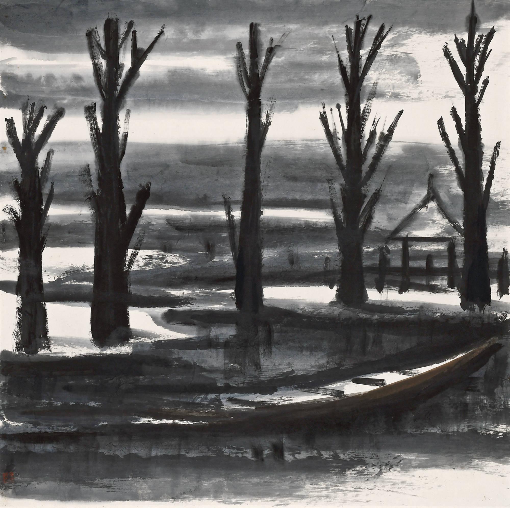 林風眠《泊舟》帶有(yǒu)其彩墨創作(zuò)成熟時(shí)期的典型特征,畫(huà)面形式融合中西,營造出空(kōng)寂澄澈氛圍,又有(yǒu)一絲平靜的況味。吳冠中《家(jiā)鄉筍》繪于1980年代,挺拔的修竹、粗壯的竹筍、地面的色點,形成和(hé)諧的點線及色彩節奏,譜出一曲春之歌(gē)。