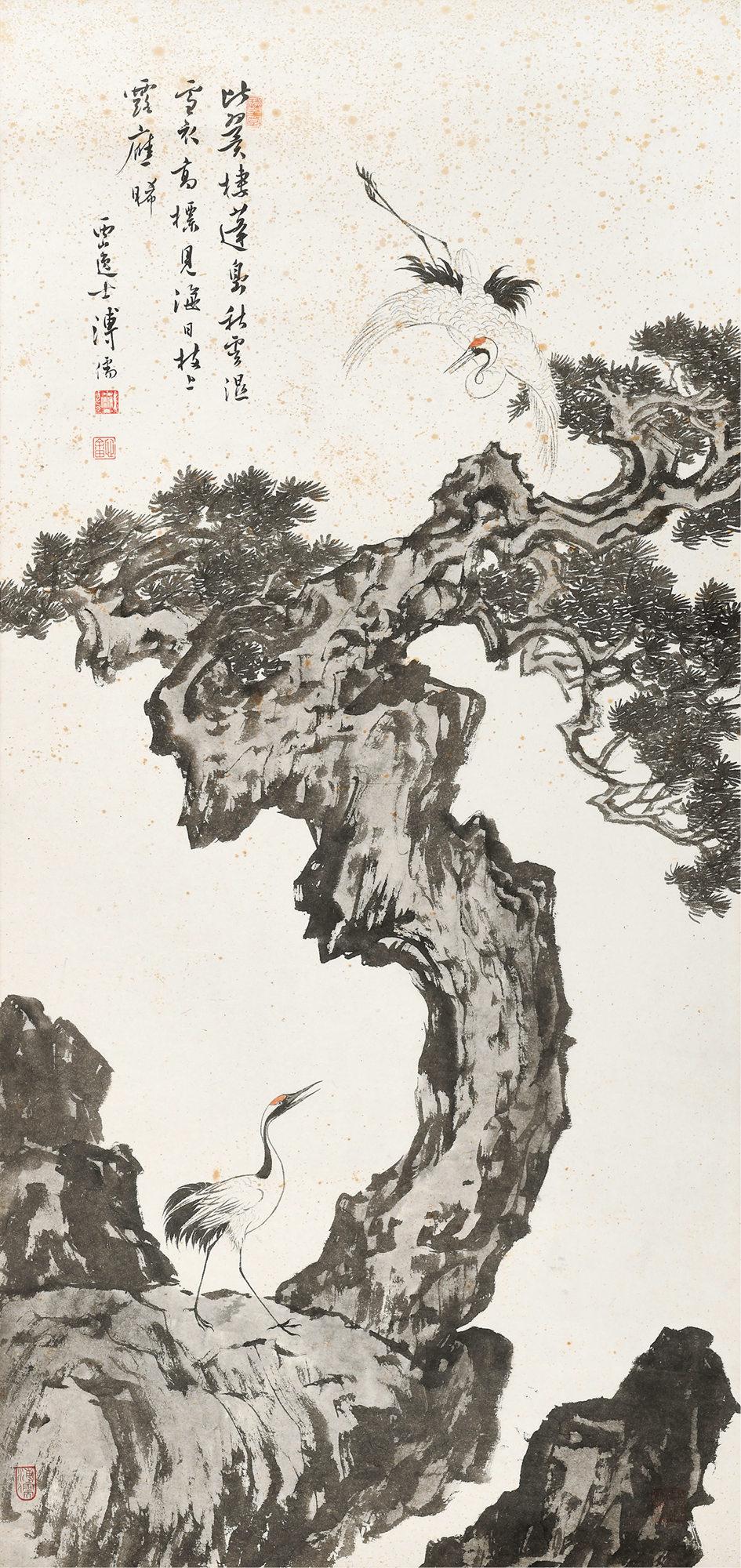 溥心畬《柳下鍾馗》追摹明(míng)李士達《寒林鍾馗》,鍾馗、小(xiǎo)鬼造型奇異,生(shēng)動活潑,筆墨潇灑流暢,為(wèi)典型的溥氏面目。《比翼濕雪衣》繪古松虬幹茂葉,高(gāo)立參天,間(jiān)寫仙鶴一對,高(gāo)下相顧,筆底透露輕松自信,彰顯王孫超逸之韻。