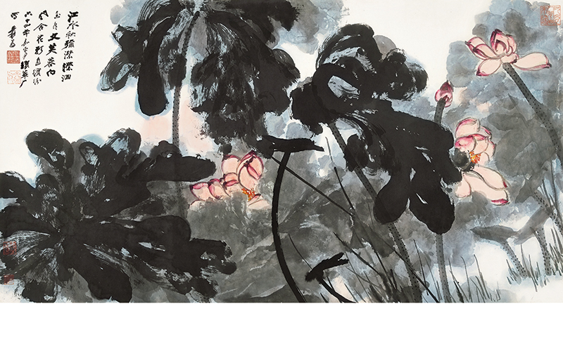 大(dà)千畫(huà)荷,初學八大(dà),受石濤影(yǐng)響更深,他曾謂:“清湘花(huā)卉蔬果尤隽永有(yǒu)緻,不落白陽、青藤窠臼……先施水(shuǐ)墨,後籠淺绛,蓋亦山(shān)水(shuǐ)法也。”他的許多(duō)花(huā)卉畫(huà),特别是畫(huà)荷,皆運用石濤這種先用水(shuǐ)墨,再罩花(huā)青、赭石的方法。晚年又将自創的潑墨潑彩運用到畫(huà)荷,氣勢豪放,為(wèi)其繪事一絕。 畫(huà)中勾勒線條,包括荷花(huā)、水(shuǐ)草等,流露出很(hěn)強的毛筆運行(xíng)之鋒穎感,特别是花(huā)瓣,先用淡墨勾出帶有(yǒu)尖銳筆意的造型,再以濃墨廓尖,上(shàng)濃下淡,使荷花(huā)看起來(lái)更有(yǒu)立體(tǐ)感,受石濤技(jì)法影(yǐng)響。占據畫(huà)面主體(tǐ)蓬蓬勃勃的荷葉造型與紛披的用筆,則更傾向于八大(dà)。然而,經過幾十年的歲月滄桑,石濤、八大(dà)在他筆下,留下的隻是門(mén)徑,精神則全然是大(dà)千自己。 此作(zuò)構圖飽滿:前景三叢蓬勃的荷葉,以濃墨潑寫,幾乎占據畫(huà)面半壁空(kōng)間(jiān),葉片溢出畫(huà)面,将空(kōng)間(jiān)拓展至畫(huà)外;後景田田荷葉以淡墨寫出,迷離朦胧,烘托出前景重墨荷葉的縱橫氣勢。數(shù)朵粉荷穿插,中央偏左位置一朵盛開(kāi)的荷花(huā),掩映在荷葉間(jiān);右側繪含苞、怒放、将殘的三朵荷花(huā),與之遙遙呼應,荷花(huā)雖情态不一,卻顧盼相應,或喻示着花(huā)的一生(shēng)。