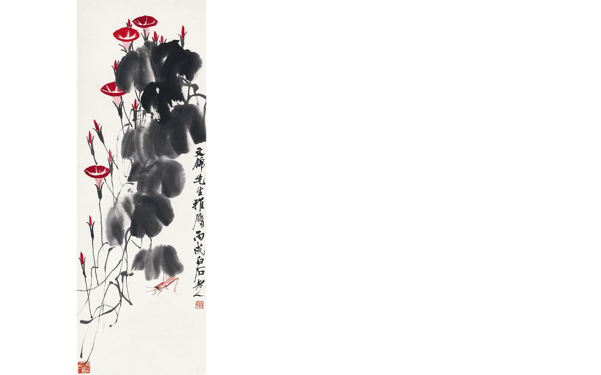 《牽牛花(huā)蚱蜢》作(zuò)于1946年,采用畫(huà)家(jiā)擅長的豎幅構圖,葉片以濕潤的闊筆鋪就,落筆大(dà)膽恣肆,由濃至淡交替穿插,豐厚飽滿,富有(yǒu)層次變化;花(huā)朵或盛放、或含苞,點綴枝頭,高(gāo)低(dī)錯落,井然有(yǒu)序;底部藤蔓蜿蜒而上(shàng),意态自然。畫(huà)面下方,一隻蚱蜢伏于葉底,筆簡意足,與向上(shàng)而生(shēng)的紅花(huā)墨葉搭配得(de)宜,生(shēng)機頓生(shēng)。 畫(huà)面左下角的白文印“買絲願繡繡絲人(rén)”為(wèi)點睛之筆,穩定畫(huà)面。“繡絲”語出唐李賀《浩歌(gē)》:“買絲繡作(zuò)平原君,有(yǒu)酒惟澆趙州土。”後引申為(wèi)對人(rén)表示崇敬。“願繡繡絲人(rén)”有(yǒu)自誇之意,可(kě)見齊白石對自己畫(huà)藝的肯定。