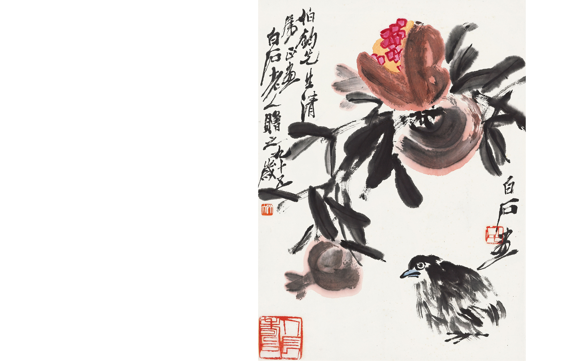《平安多(duō)子》作(zuò)于1955年,畫(huà)家(jiā)當時(shí)九十五歲,為(wèi)其藝術(shù)創作(zuò)最後的巅峰期。晚年的齊白石有(yǒu)“人(rén)民藝術(shù)家(jiā)”美譽,精神暢旺,落筆神采自現。 畫(huà)中鹌鹑取意“平安”,石榴喻“多(duō)子”,寓有(yǒu)平安多(duō)子的美意。石榴以沒骨法寫出,闊筆塗抹,赭墨交融,描繪出石榴圓潤飽滿的形态。斜出的枝葉以墨筆揮就,運筆沉着飛動,葉片向背反側,枯潤相間(jiān)。最上(shàng)方的一顆石榴“笑口正開(kāi)”,以曙紅點畫(huà)出籽粒,燦若珠玑。全幅筆墨恣肆,已入人(rén)藝俱老之境。