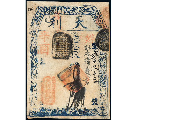 辛酉年(1861年)北京地安門(mén)外“天利銀錢(qián)号”簡印式制(zhì)錢(qián)票(piào)壹拾吊一枚,辨字二百六十三号,該銀号為(wèi)內(nèi)務府設置“五天”官号之一,所發錢(qián)票(piào)屬官票(piào)性質;此枚票(piào)面寬闊,左下蓋書(shū)卷形“天利銀錢(qián)号”落地章,右側钤“天利銀号”騎縫章,并蓋防僞圖記,舊(jiù)時(shí)托裱,背見“收乾益号”墨書(shū);簡印式“五天”官票(piào)票(piào)幅寬闊,風格樸拙,存世稀少(shǎo),保存完整者罕見,九成新