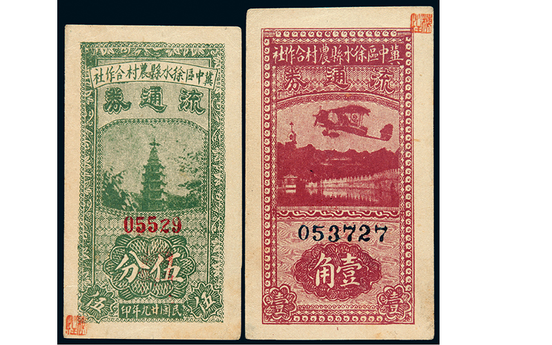 民國二十九年冀中區(qū)徐水(shuǐ)縣農村合作(zuò)社流通(tōng)券伍分、壹角各一枚,均少(shǎo)見;背左下均有(yǒu)小(xiǎo)片輕微揭薄,九二成新