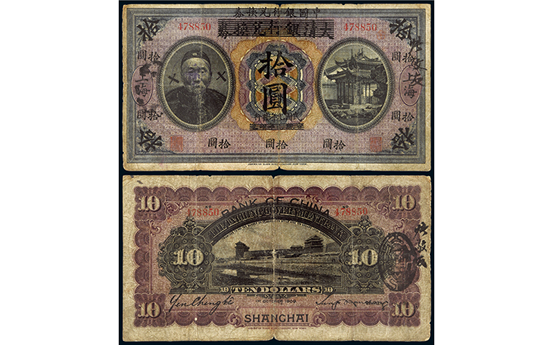 民國元年李鴻章像大(dà)清銀行(xíng)兌換券加蓋改作(zuò)中國銀行(xíng)兌換券拾圓一枚,“上(shàng)海”地名;該兌換券原票(piào)發行(xíng)于宣統元年,民國時(shí)期由中國銀行(xíng)回收,加蓋“中國銀行(xíng)兌換券”後再次發行(xíng),未久被新印就的黃帝像中國銀行(xíng)兌換券所取代;迄今,圖文清晰、未經修補、保存完整的李鴻章像改作(zuò)中國銀行(xíng)兌換券流通(tōng)票(piào),所見寥若晨星,具有(yǒu)極高(gāo)的近代貨币史料價值與收藏價值;《中國曆代貨币大(dà)系》列珍罕度四星級,PMG 15