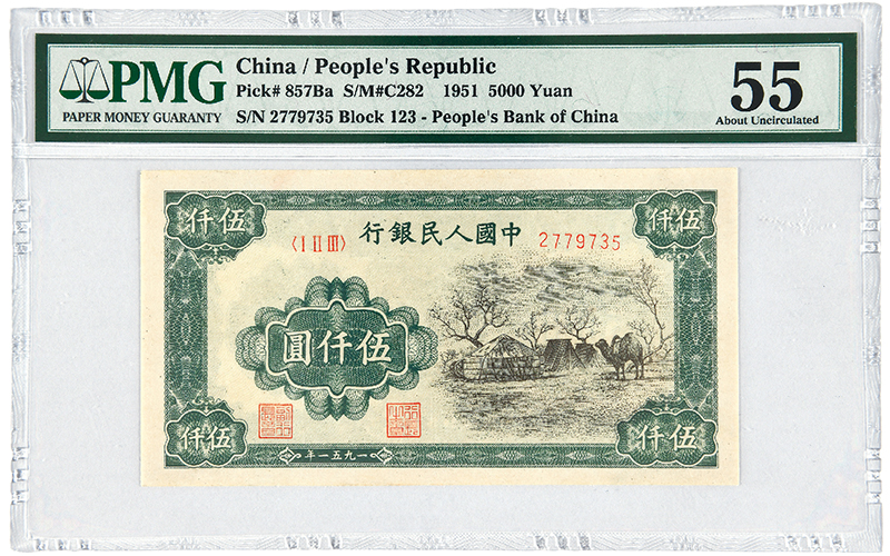 1951年第一版人(rén)民币伍仟圓“蒙古包”一枚,背蒙文,于內(nèi)蒙古地區(qū)行(xíng)用,一版币大(dà)六珍之一,稀少(shǎo)程度僅次于壹萬圓“牧馬”;當時(shí)該地區(qū)除城市範圍使用紙币之外,牧區(qū)民衆仍舊(jiù)習慣于以物易物,基本不使用紙币,因此發行(xíng)數(shù)量相對較少(shǎo),據記載,“蒙古包”總發行(xíng)量在500萬枚以內(nèi),退出流通(tōng)時(shí)回收十分徹底,流通(tōng)票(piào)流傳至今已極為(wèi)少(shǎo)見,目前統計(jì)存世未逾百枚;此枚票(piào)面整潔,原色鮮豔,品相于所見“蒙古包”流通(tōng)票(piào)中,堪稱出類拔萃,極為(wèi)珍貴,PMG 55,目前為(wèi)該公司評級榜單唯一亞軍分