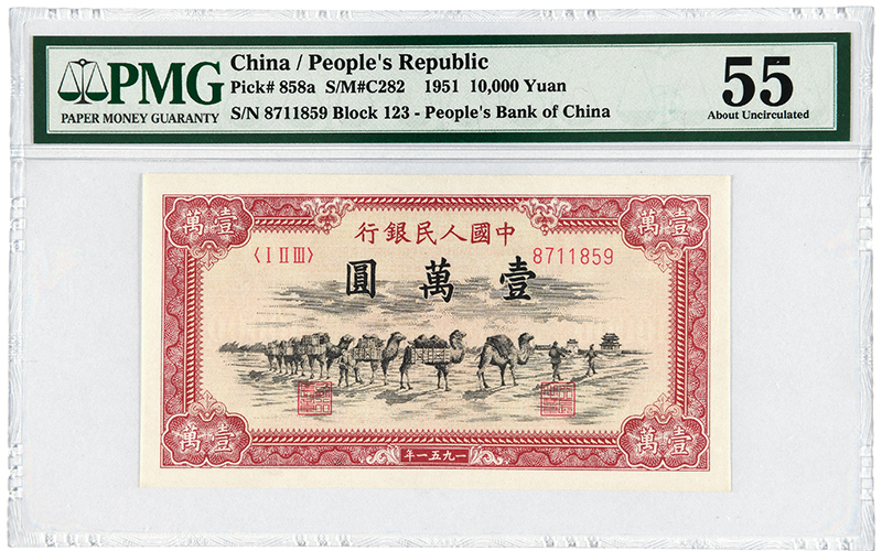 1951年第一版人(rén)民币壹萬圓“駱駝隊”一枚,背維文,新疆地區(qū)行(xíng)用,一版币大(dà)六珍之一,系一版币中唯一使用挪威産道(dào)林紙印制(zhì)的票(piào)券,票(piào)面整潔,顔色鮮豔,為(wèi)目前所見“駱駝隊”品相之佼佼者,PMG 55
